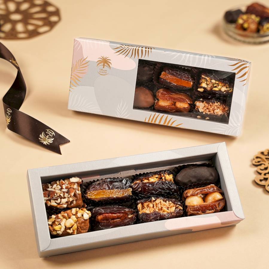 A perfect harmony of rich, premium dates stuffed with crunchy nuts, elegantly packed to delight your senses. Every bite is a celebration of exquisite flavor and tradition, crafted to add sweetness to your moments. Experience the royal essence of Saudi heritage in every box.