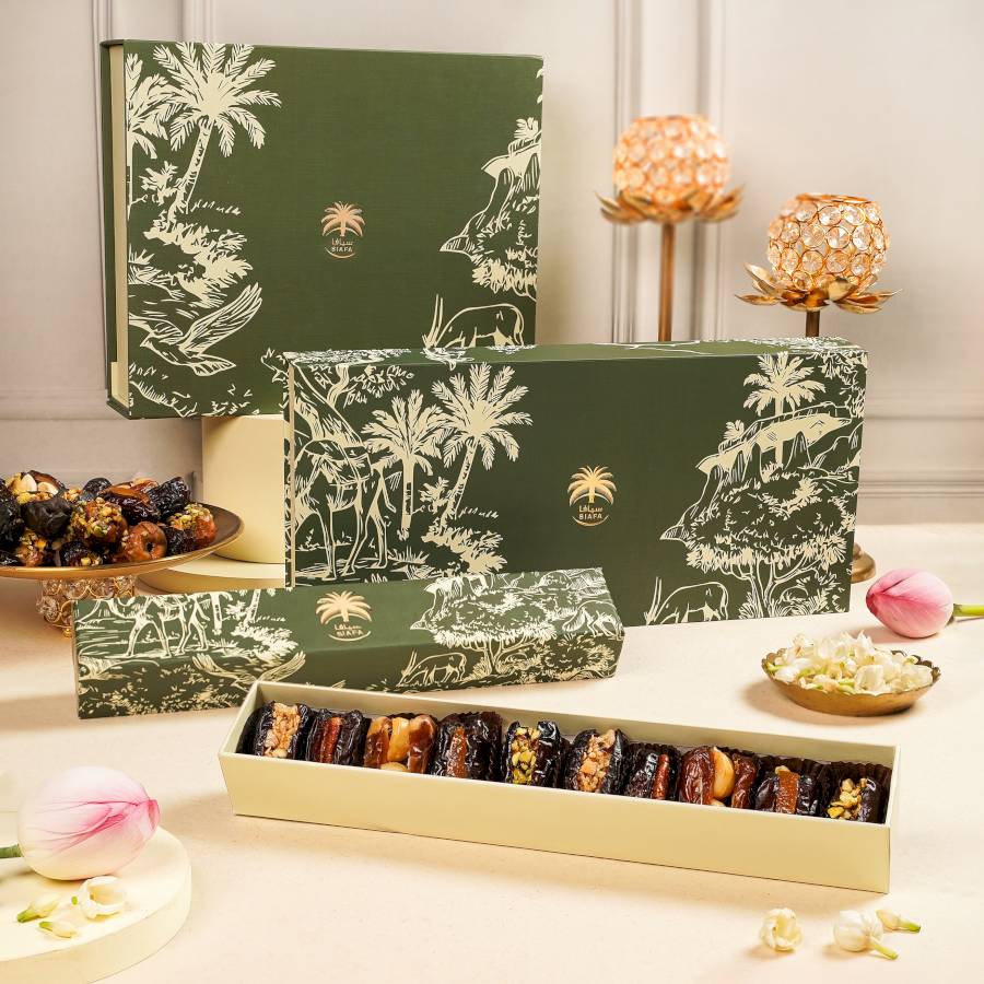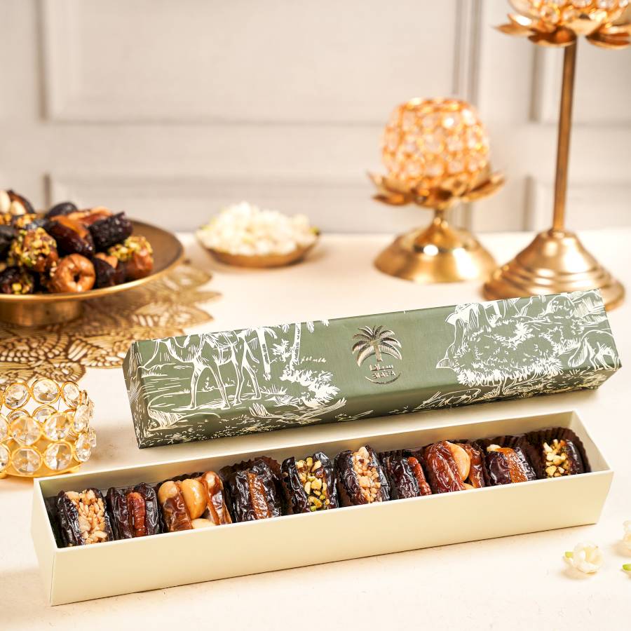 A refreshing green box, symbolizing wellness and harmony, filled with gourmet dates.