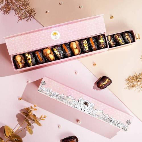 An elegant blue box filled with handpicked dates, generously stuffed with roasted nuts.